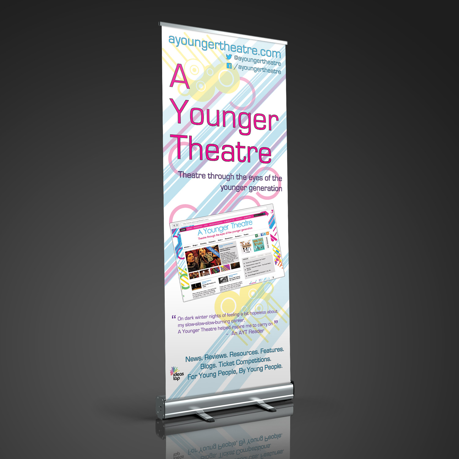 - Promotional banner. This banner, designed to fit within a brand established by the website and other promotional material, welcomed guests to AYT's presence at the Edinburgh Fringe Festival.